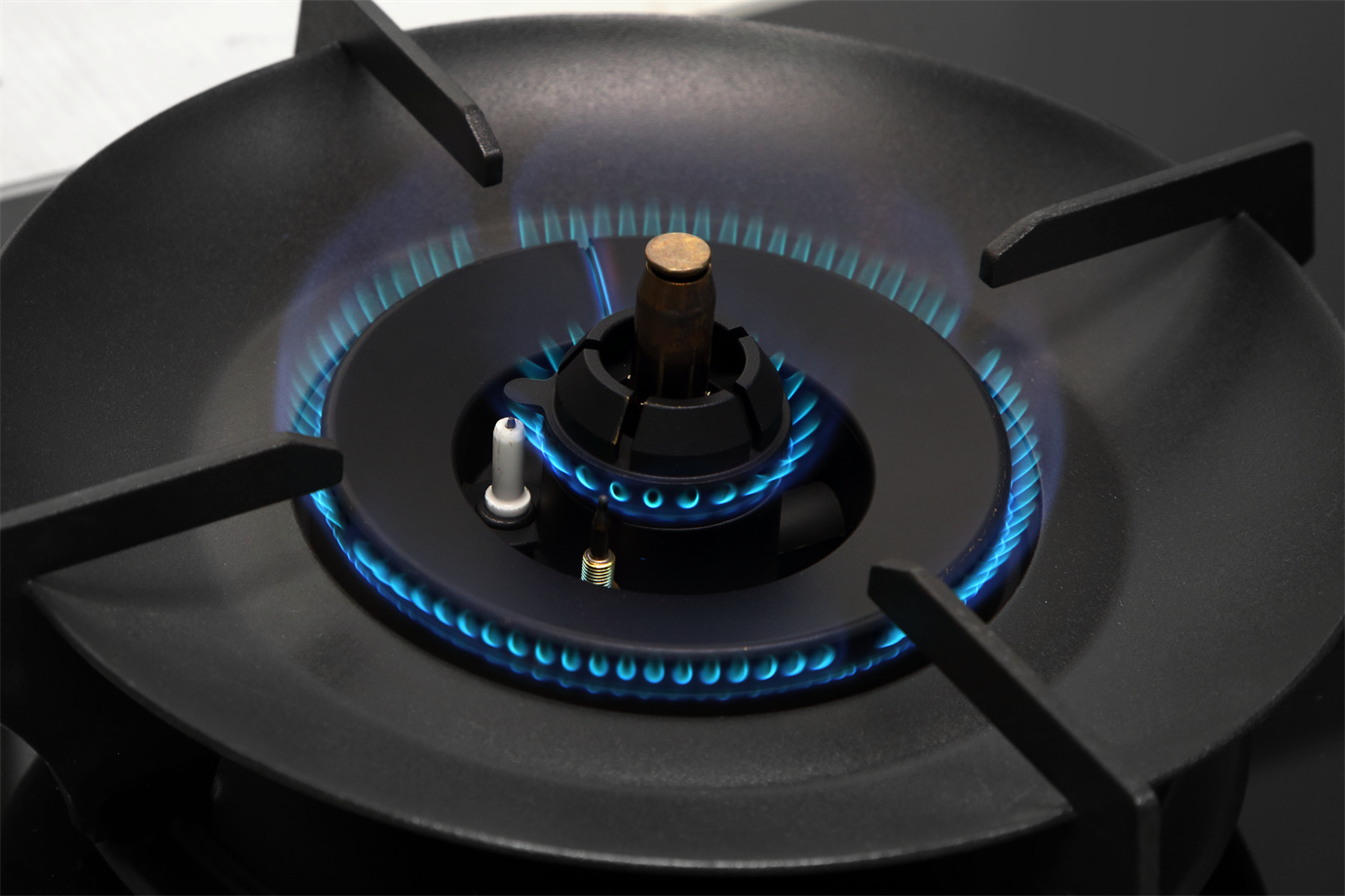 Crafted with tempered glass and supported by robust cast iron grids with cross brace stands, it features energy-gathering pans for enhanced heat efficiency, frontal knob control, and battery ignition (D size) with the battery included.