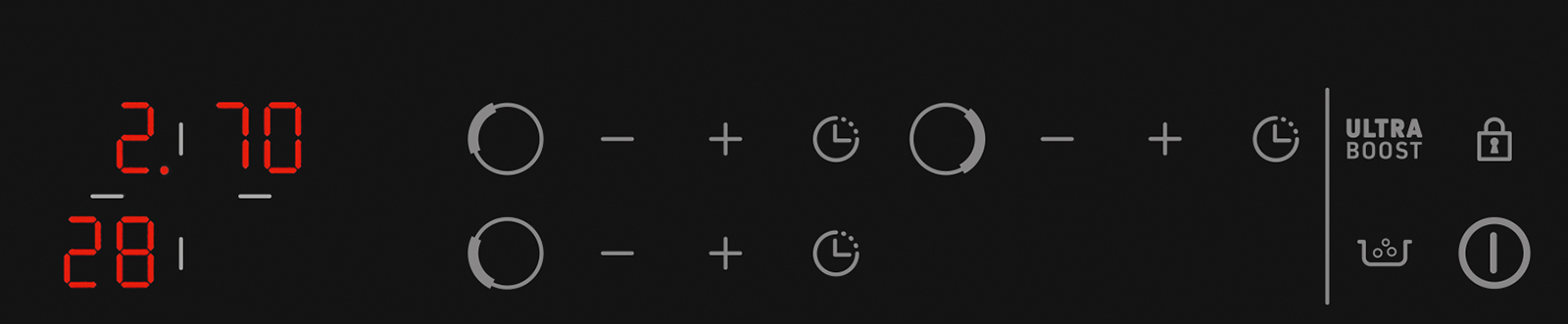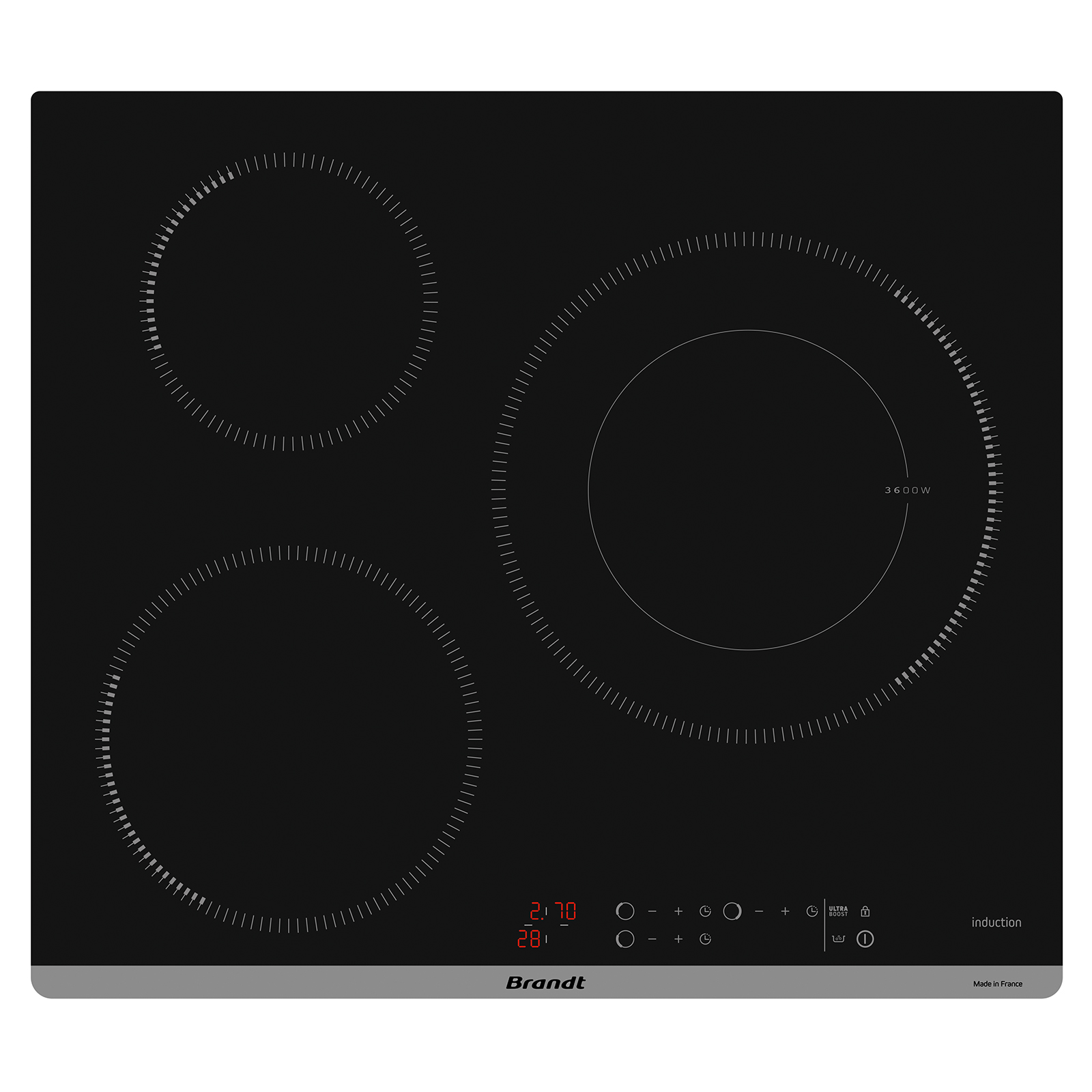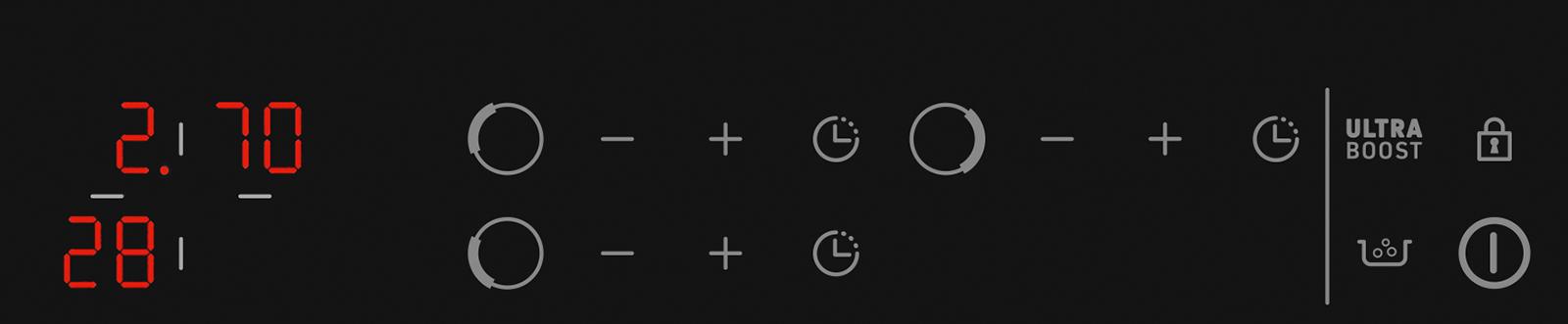 A 60cm 3-zone induction hob with 9 power levels plus ultraboost, featuring an extra-large 28cm cooking zone for versatile meal preparation.